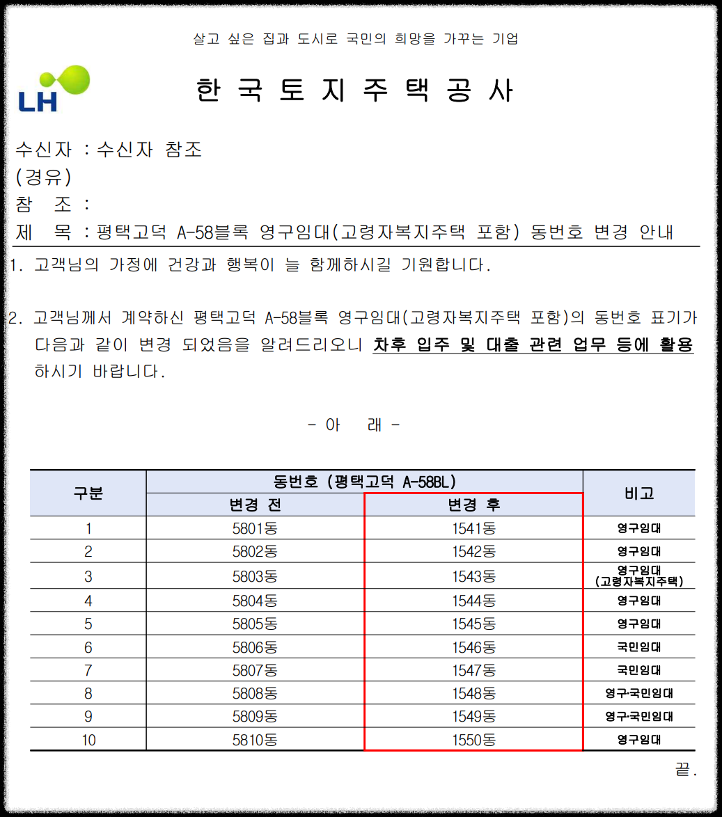 6. [LH 공지] 평택고덕 A-58블록 고령자복지주택 동번호 변경 안내