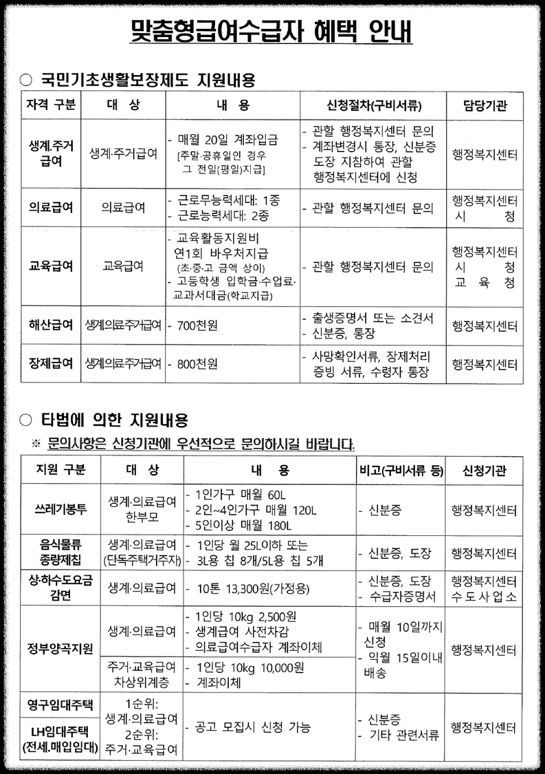 아래의 맞춤형급여수급자 혜택 안내 리스트 중 주거 급여에 해당 사항만을 행복센터  사회복지사 담당자가 확인해서 등록해 드립니다.