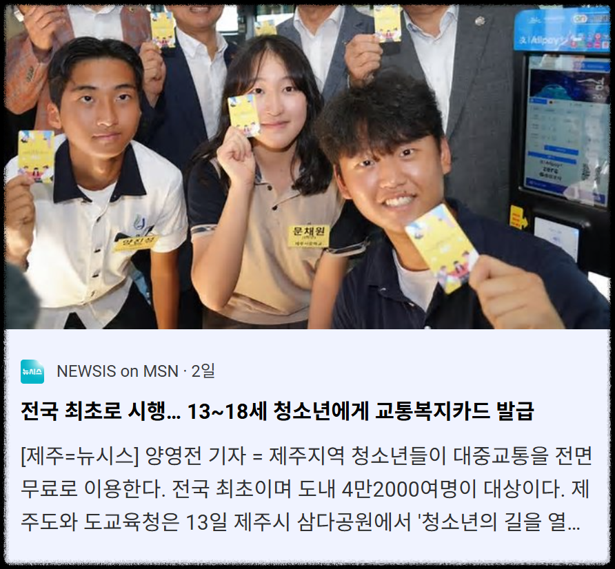 - 지원 수단: 발급된 제주교통복지카드는 제주형 결제 시스템 온(ON) 나라페이로 운영되어, 단순 이동 편의만이 아니라 교육·문화·여가 등 청소년 일상의 전반적인 이동을 지원