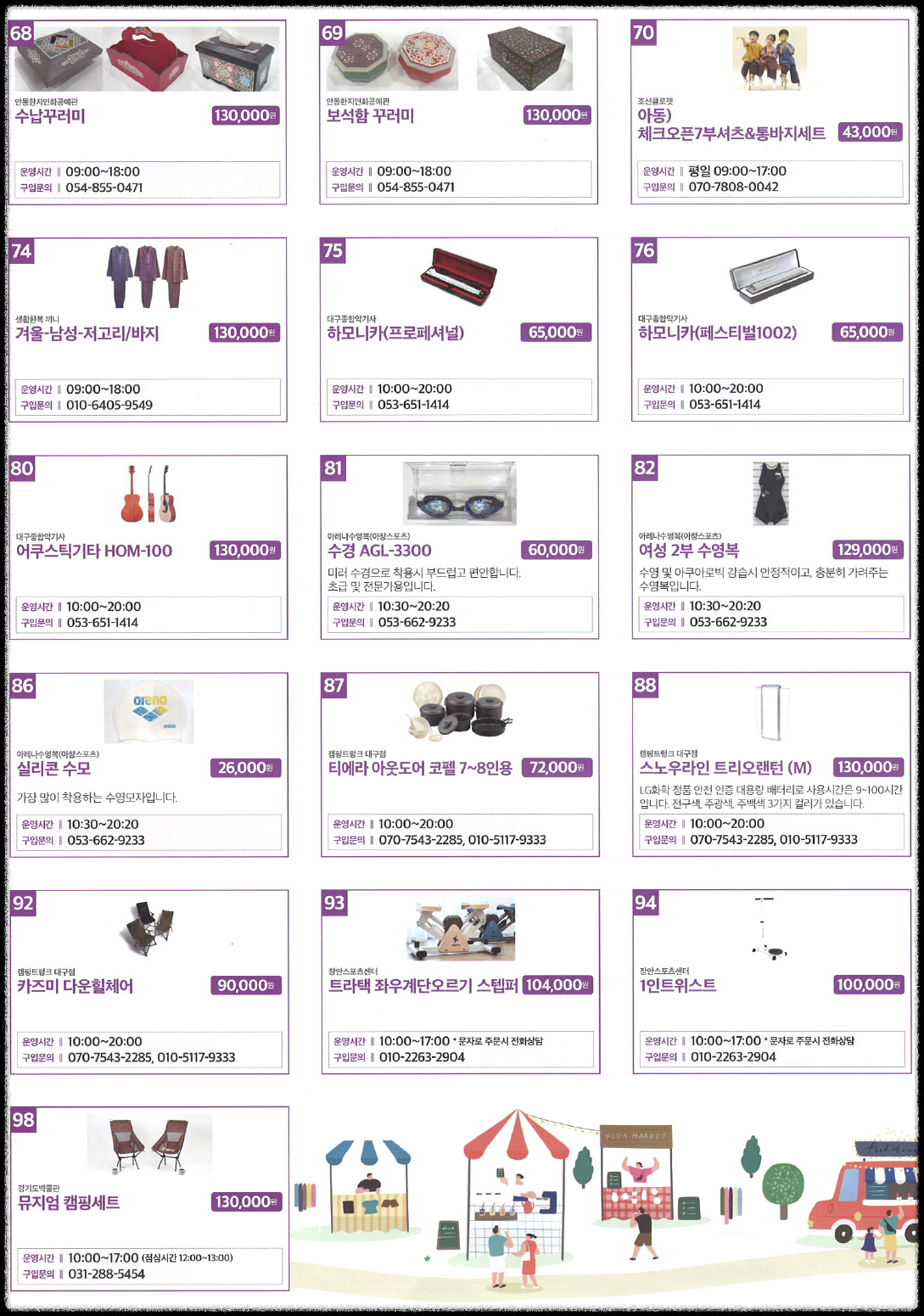 | 76 | 하모니카(데스티벌1002) | 65,000원 | 10:00~20:00 | 053-651-1414 |