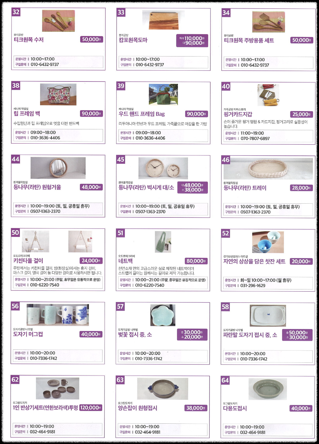 | 39 | 우드 핸드 프레임 Bag | 90,000원 | 09:00~18:00 | 010-3636-4406 |