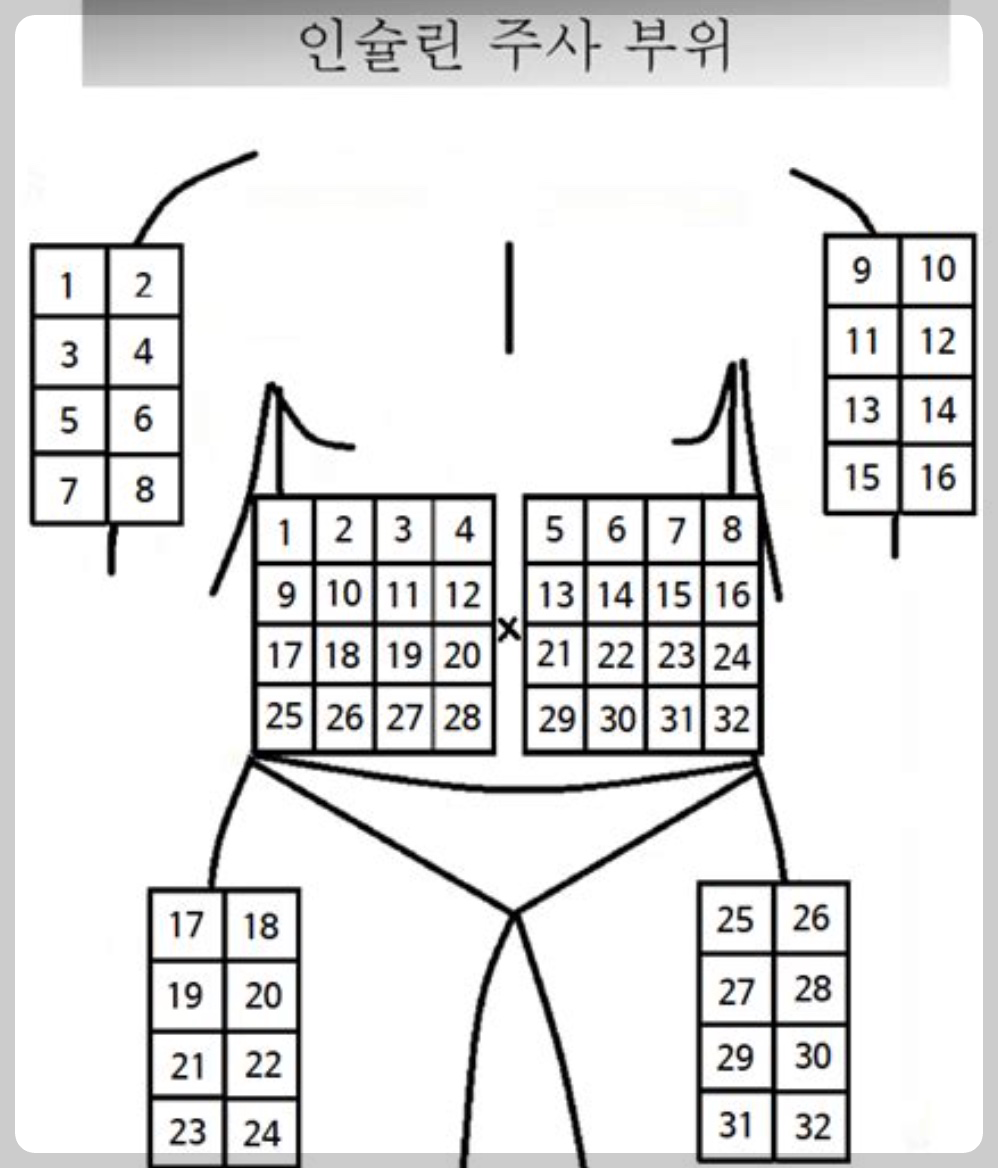 - 복부 또는 허벅지에 펜형 인슐린으로 자가주사