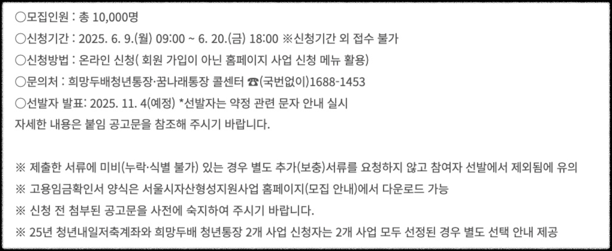 [공고] 2025년 희망 두 배 청년통장 신규 참가자 모집 안내 (접수 6/9~20)
