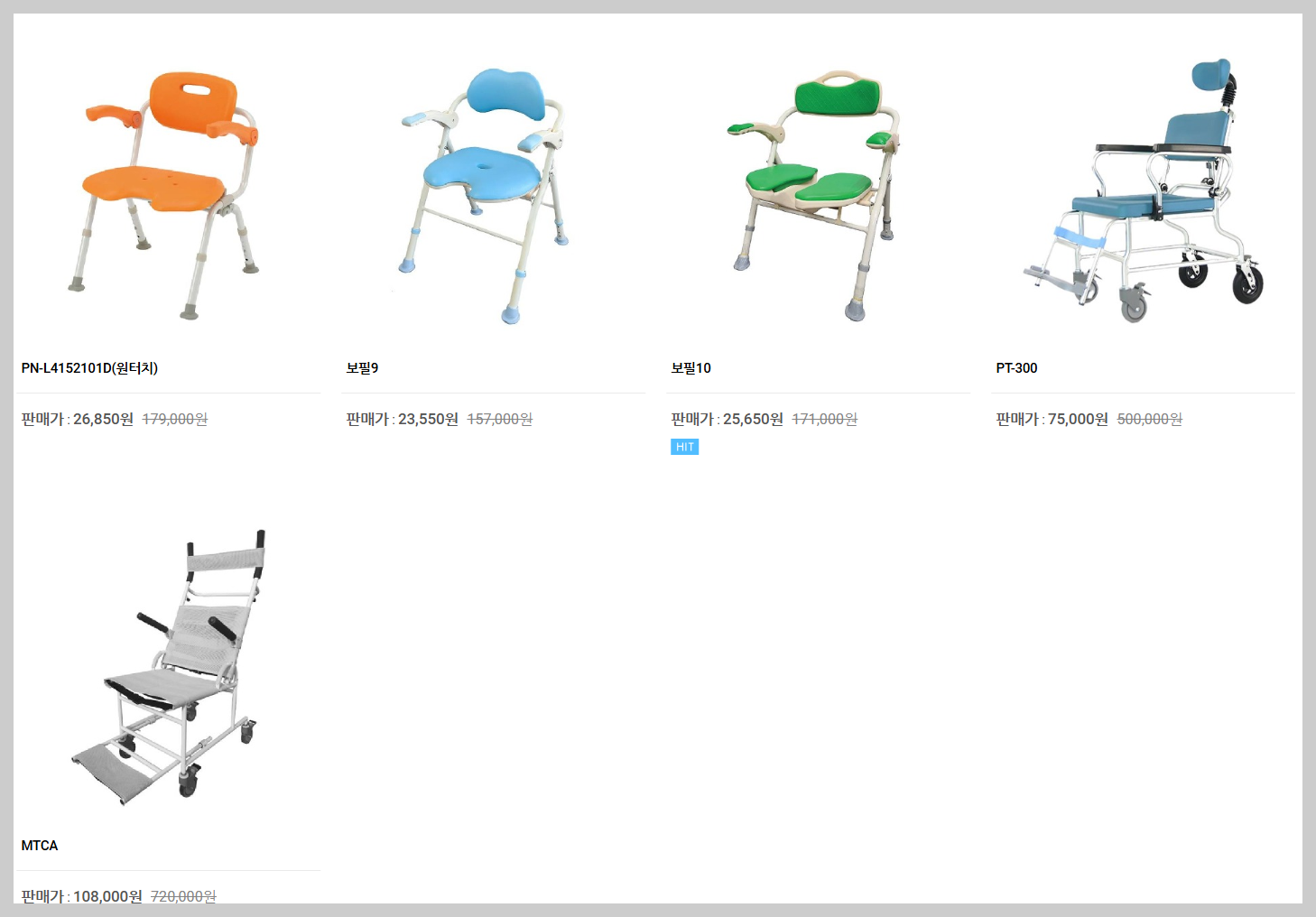 • 특징: 팔걸이, 등받이, 위생시트 포함, 일부는 휠체어 겸용